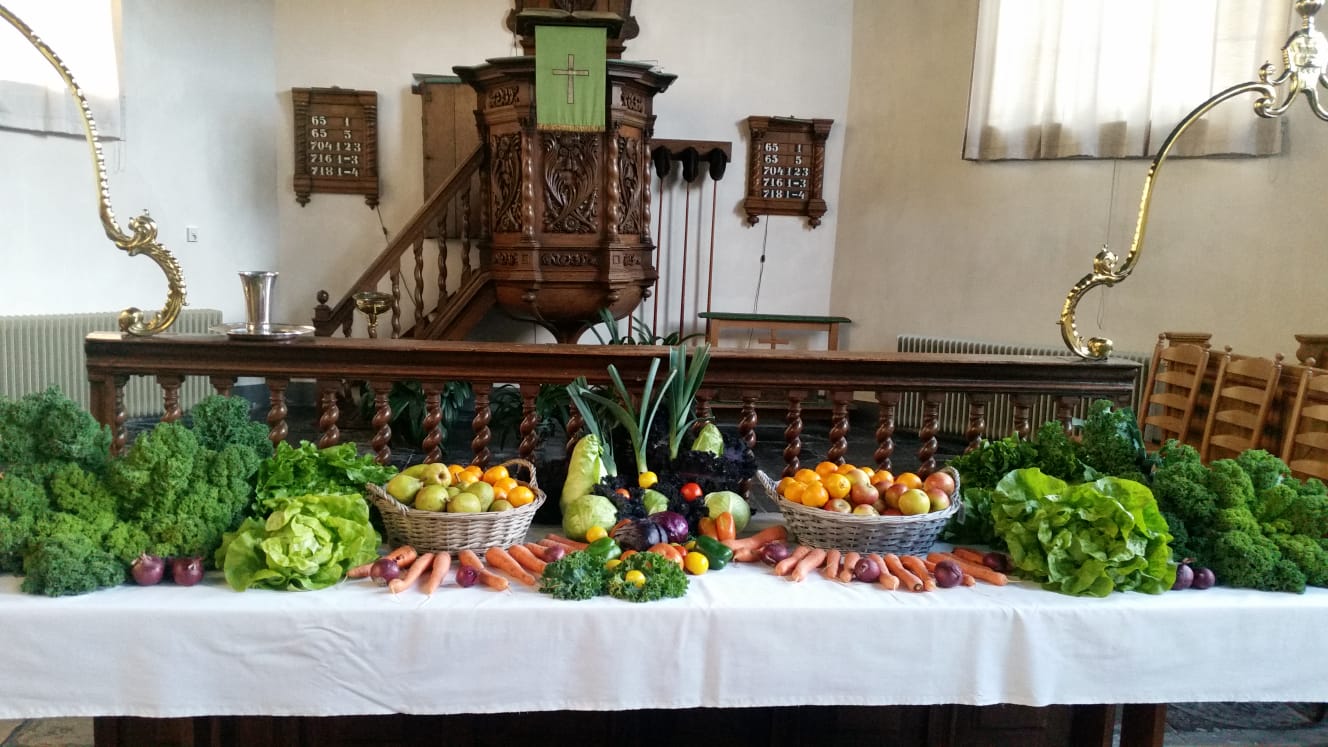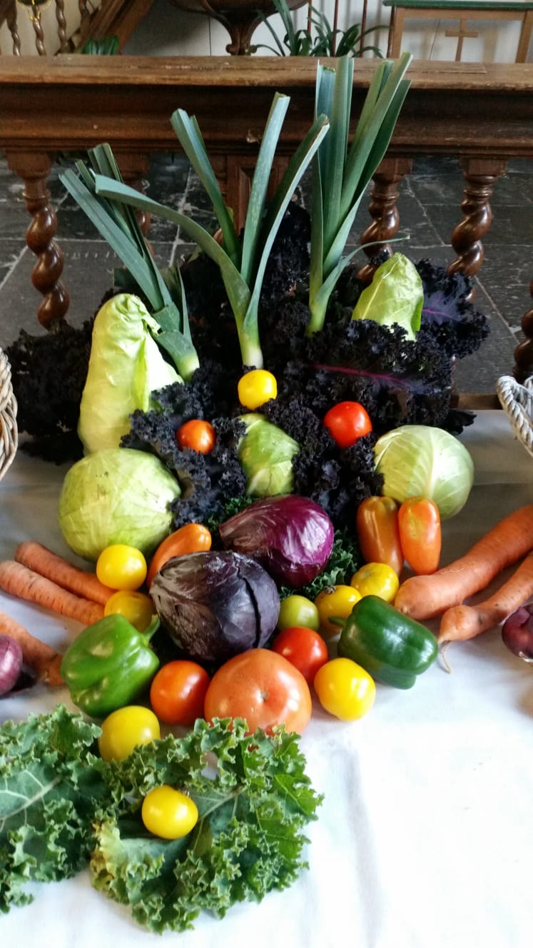 De groenten komen allemaal uit de volkstuin van Kuinre. Ook kregen we een financiële gift, om voor de liturgische tafel, fruit te kopen. Het geld wat overbleef ging zoals afgesproken naar de kerkvoogdij. Zo kon er een mooie tafel gemaakt worden om vervolgens na de dienst van deze oogsttafel te delen.